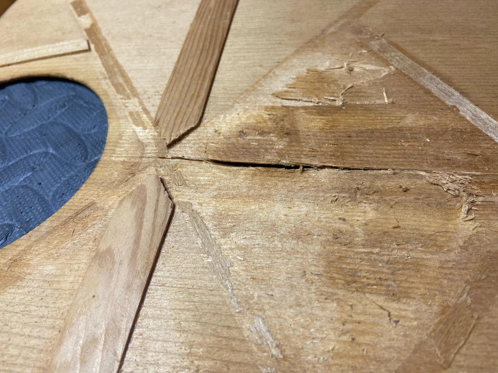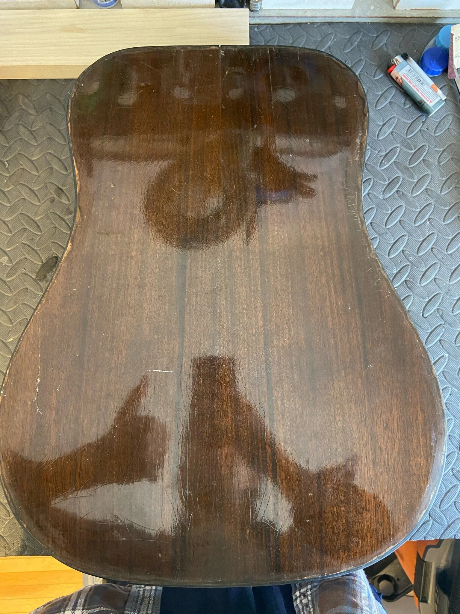 The infamous Gibson double-X brace. Loose in a lot of places and could've been salvaged, but new bracing altogether will improve the tone considerably. There's a reason this era of Gibsons aren't very sought after.