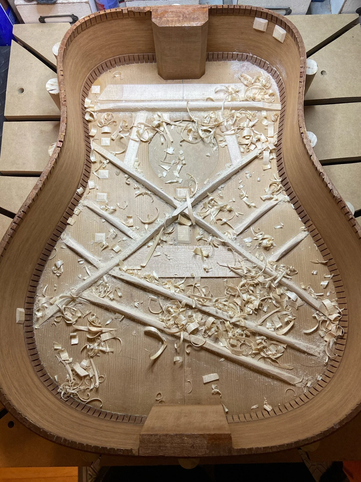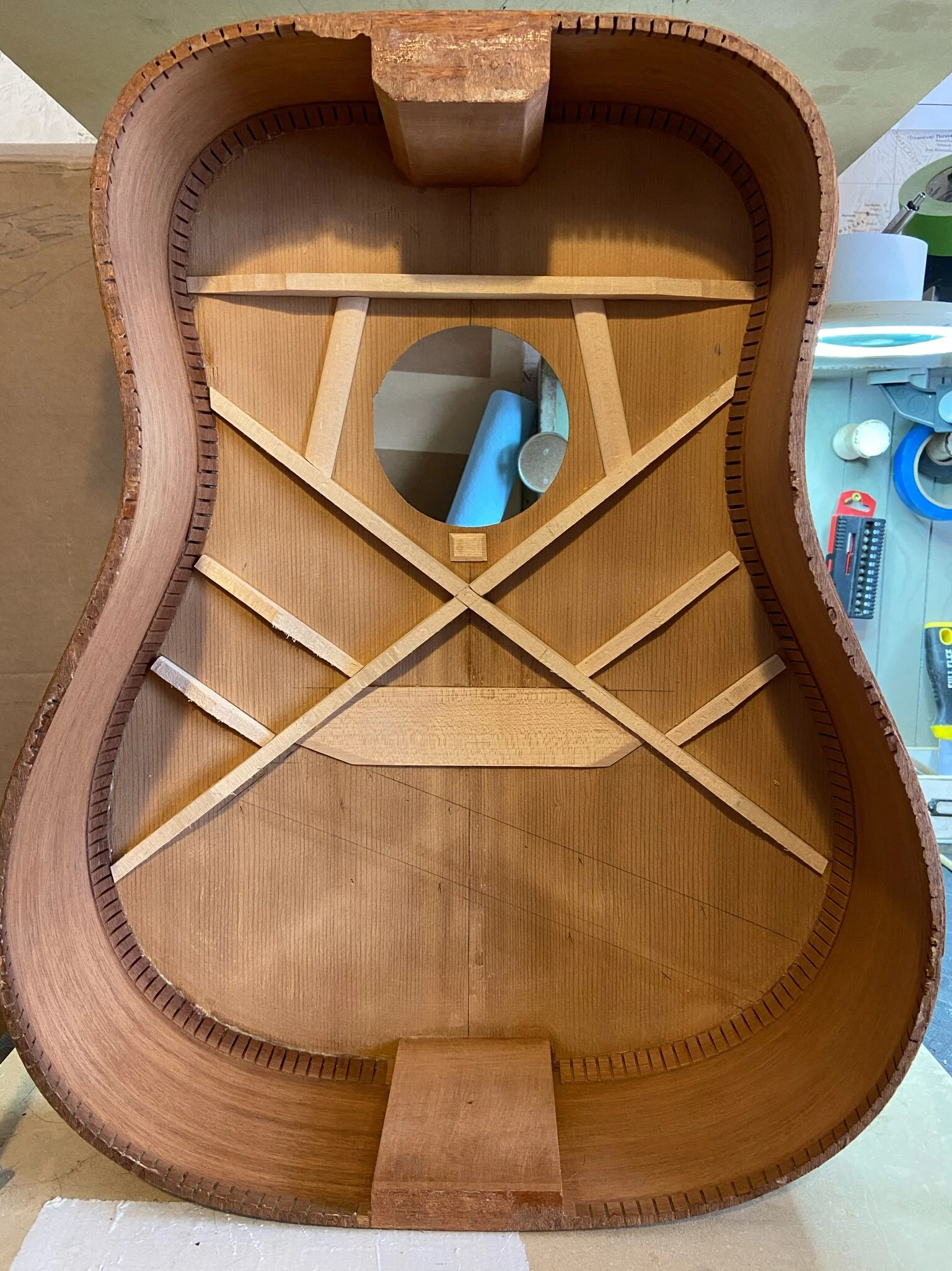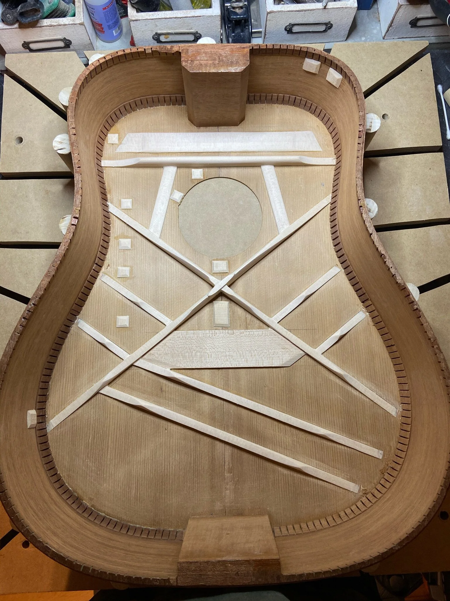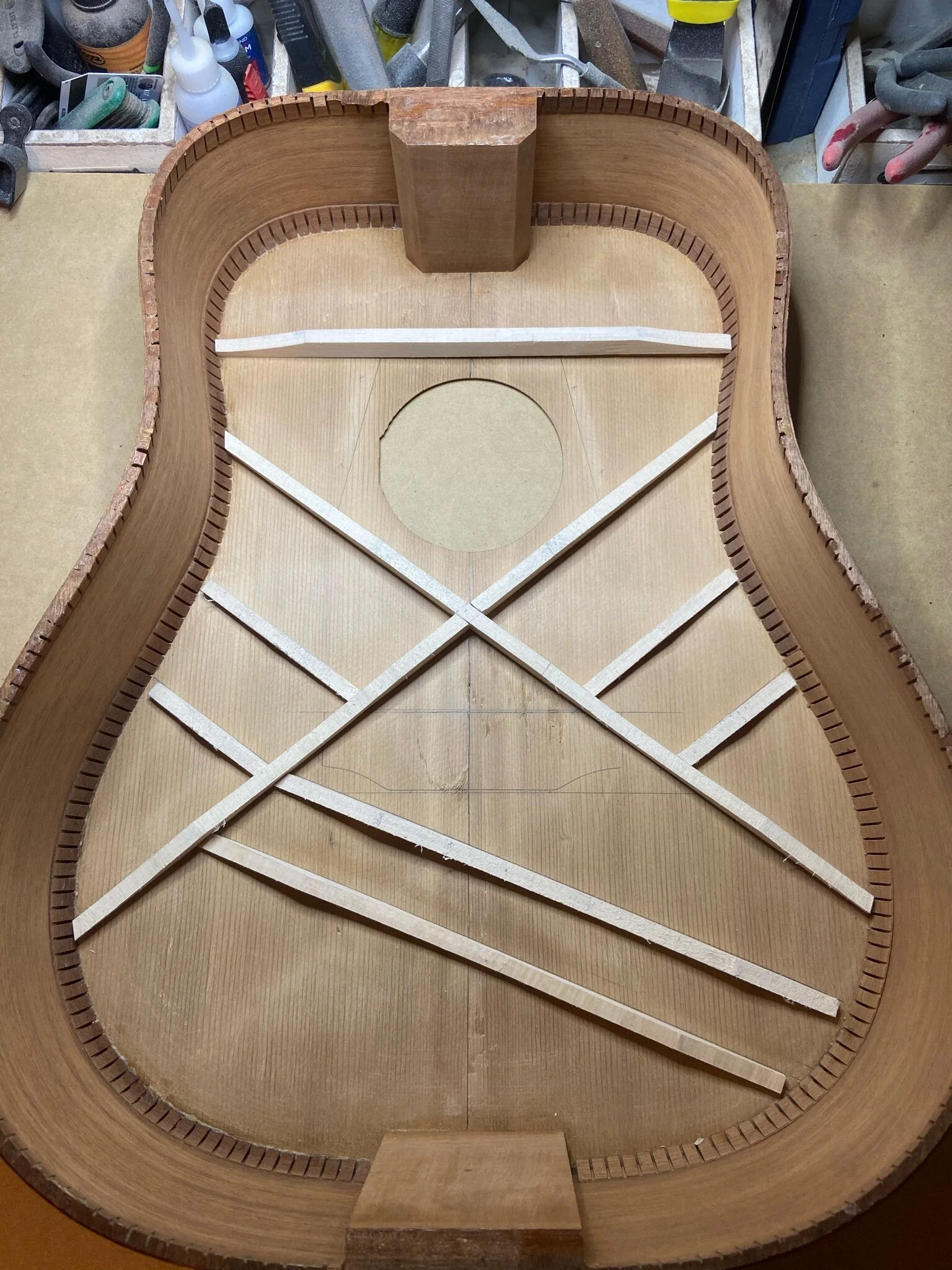 Gluing in the new X-brace. All braces below the soundhole are a 25' radius.