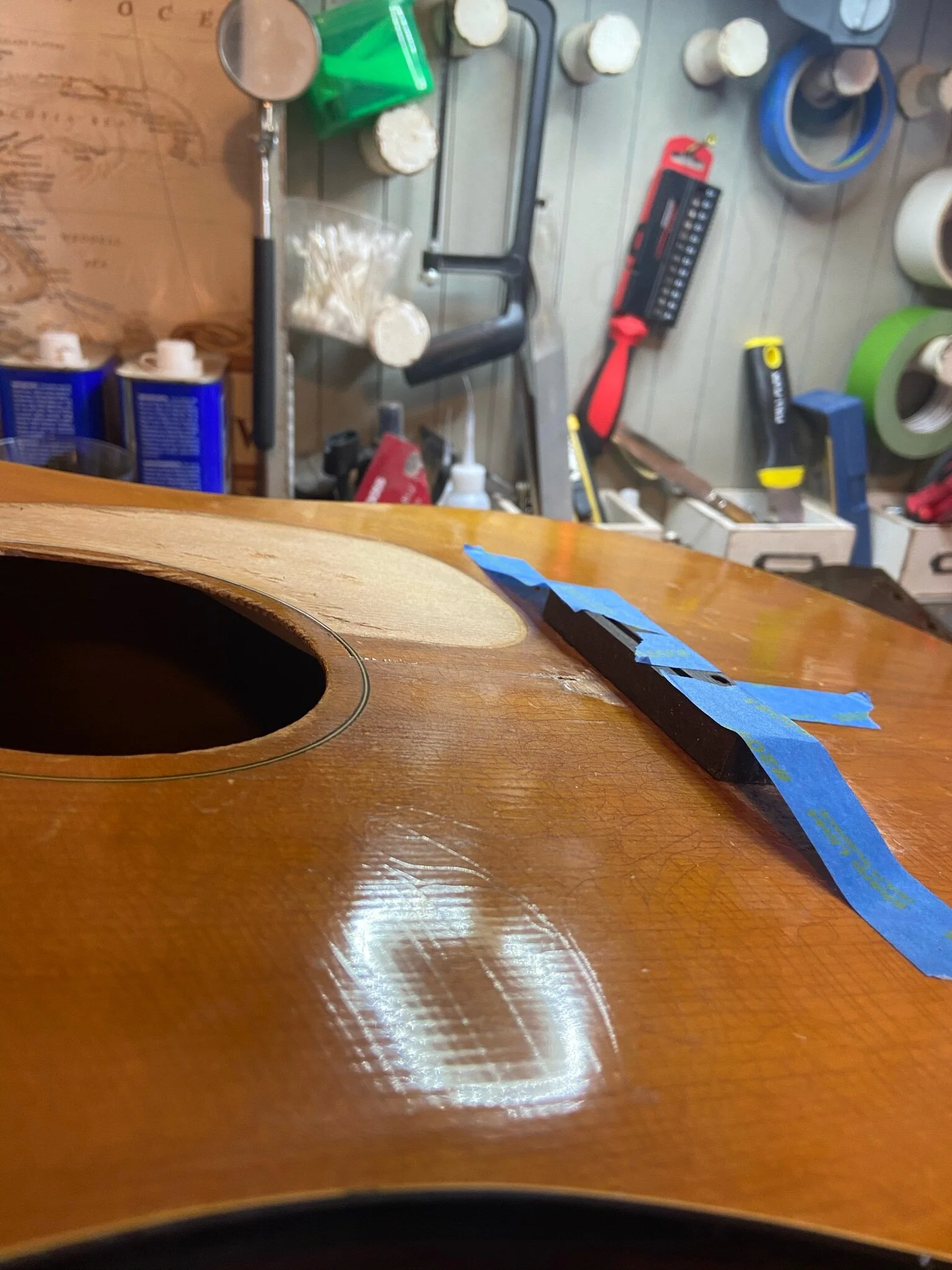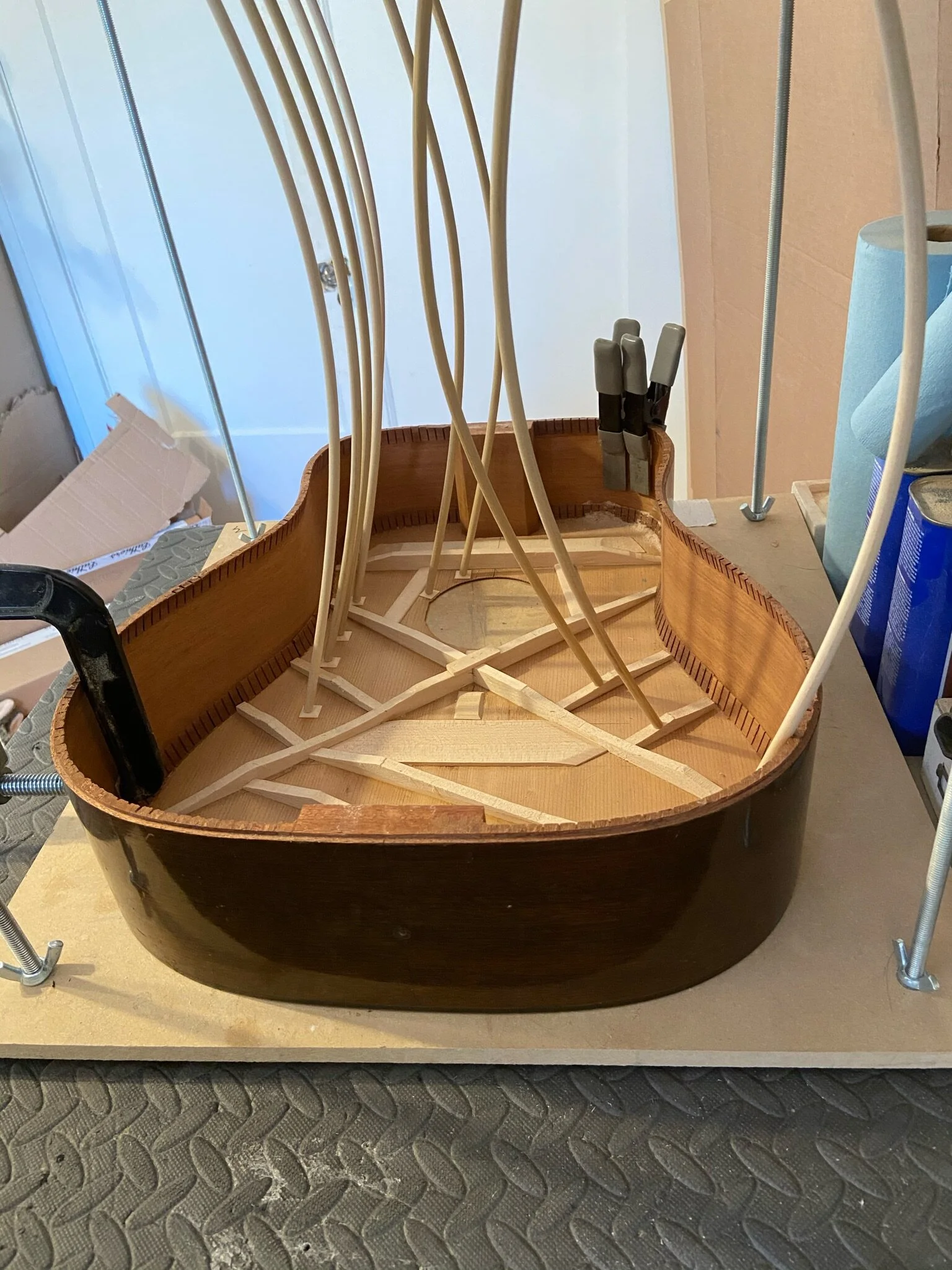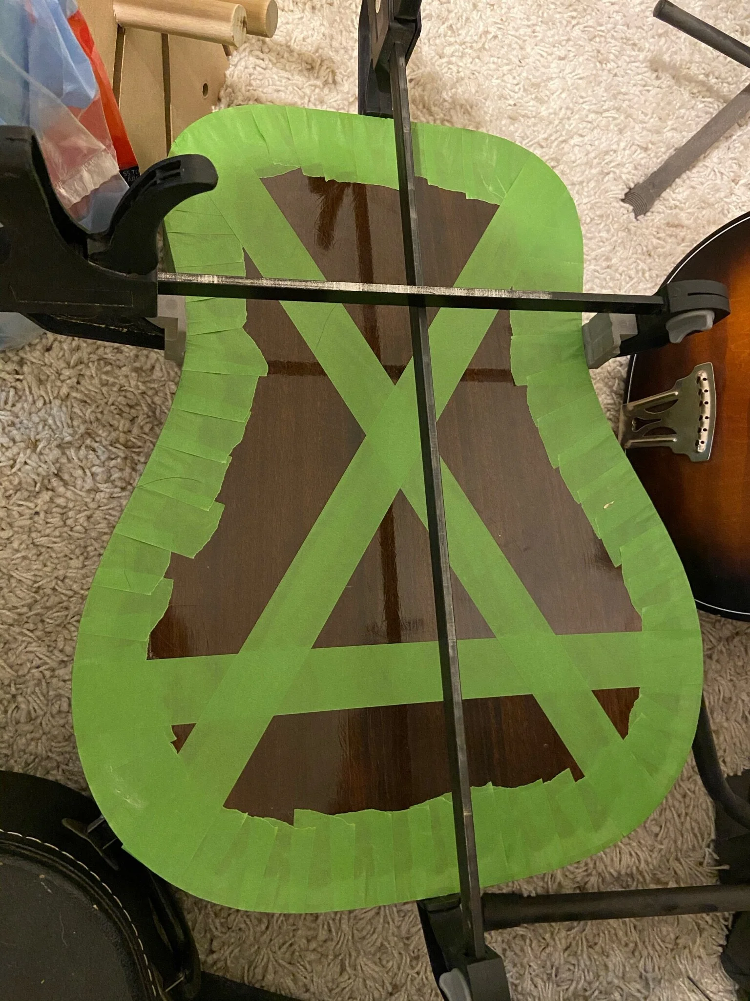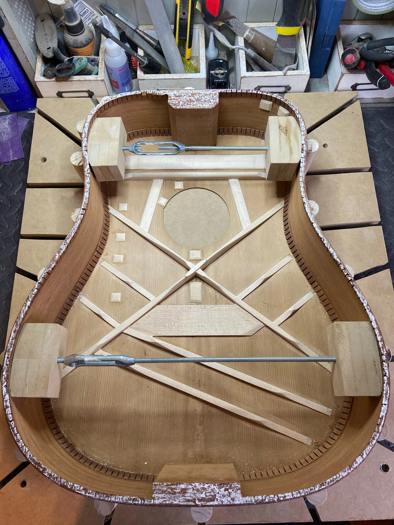 Gluing in the new X-brace. All braces below the soundhole are a 25' radius.