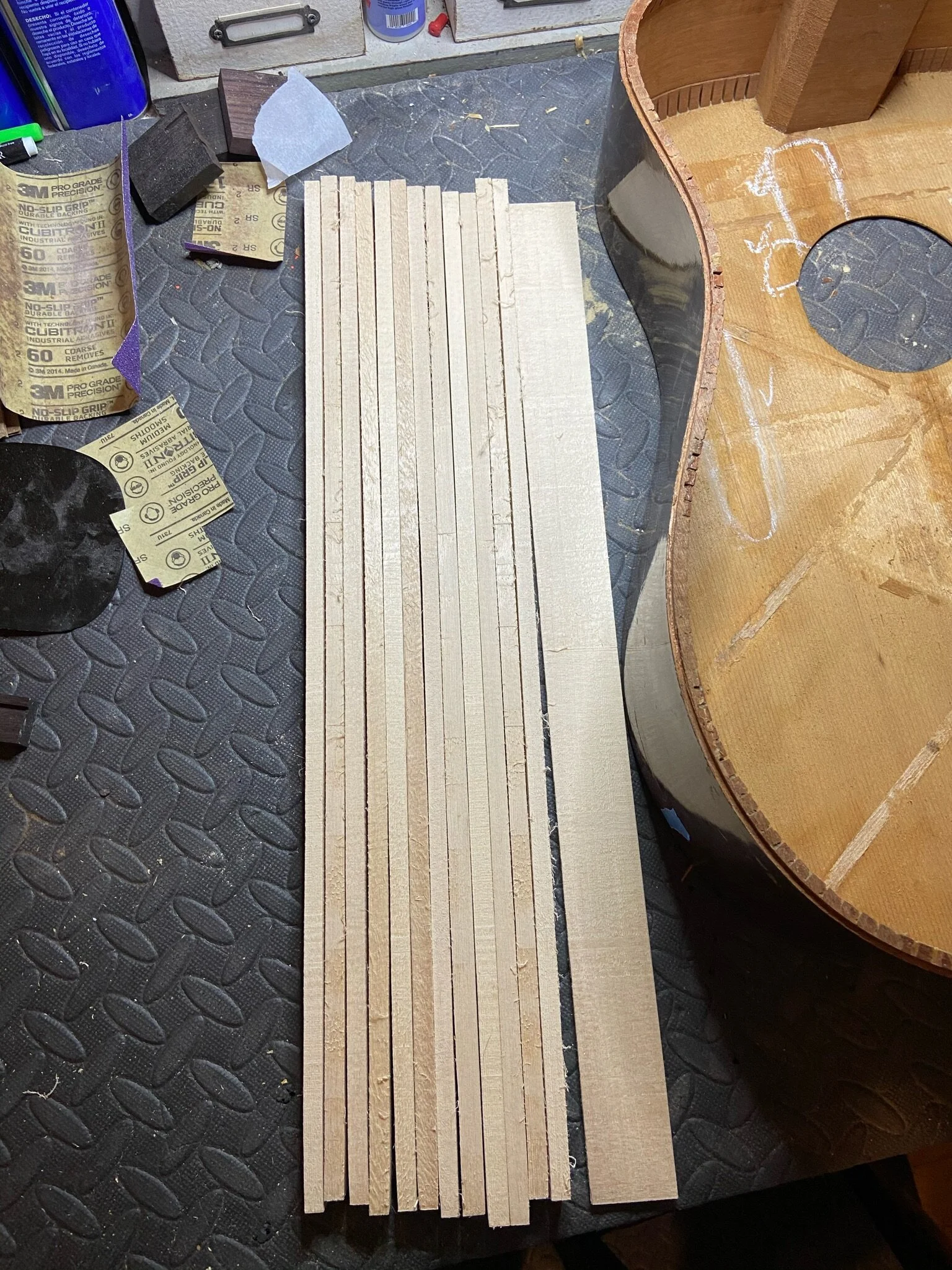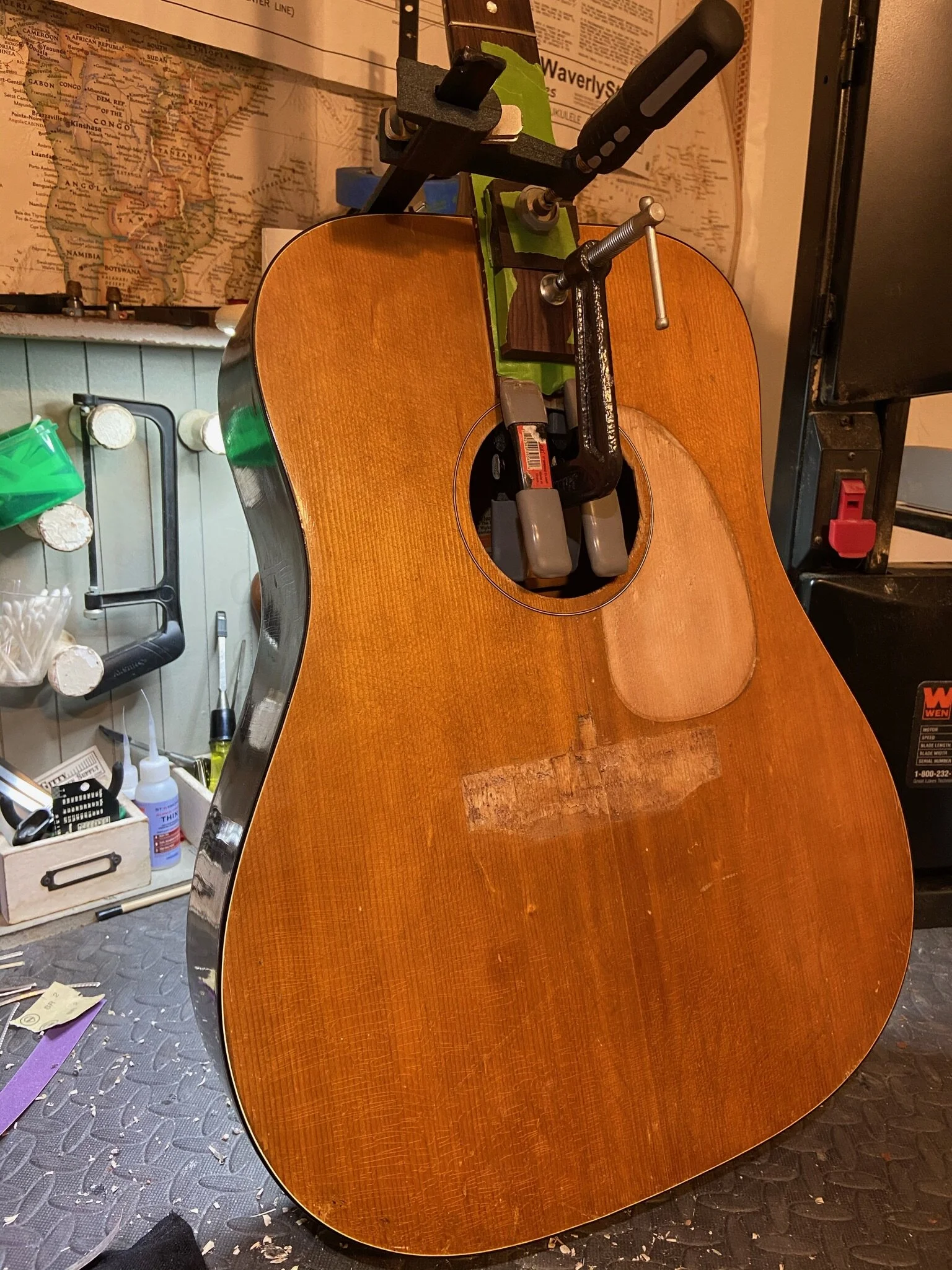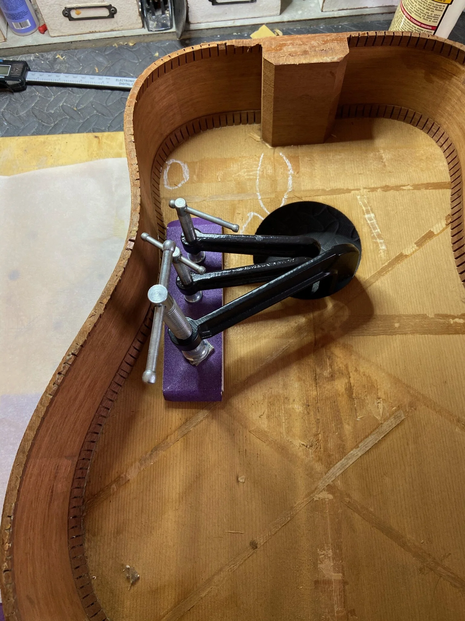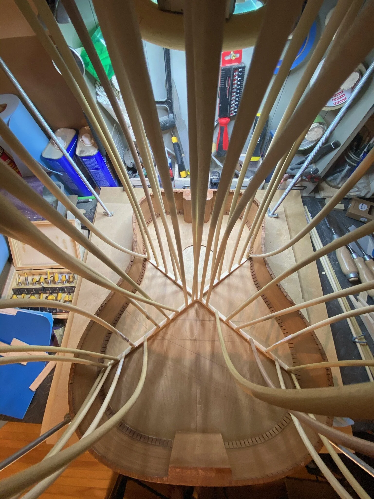 Gluing in the new X-brace. All braces below the soundhole are a 25' radius.