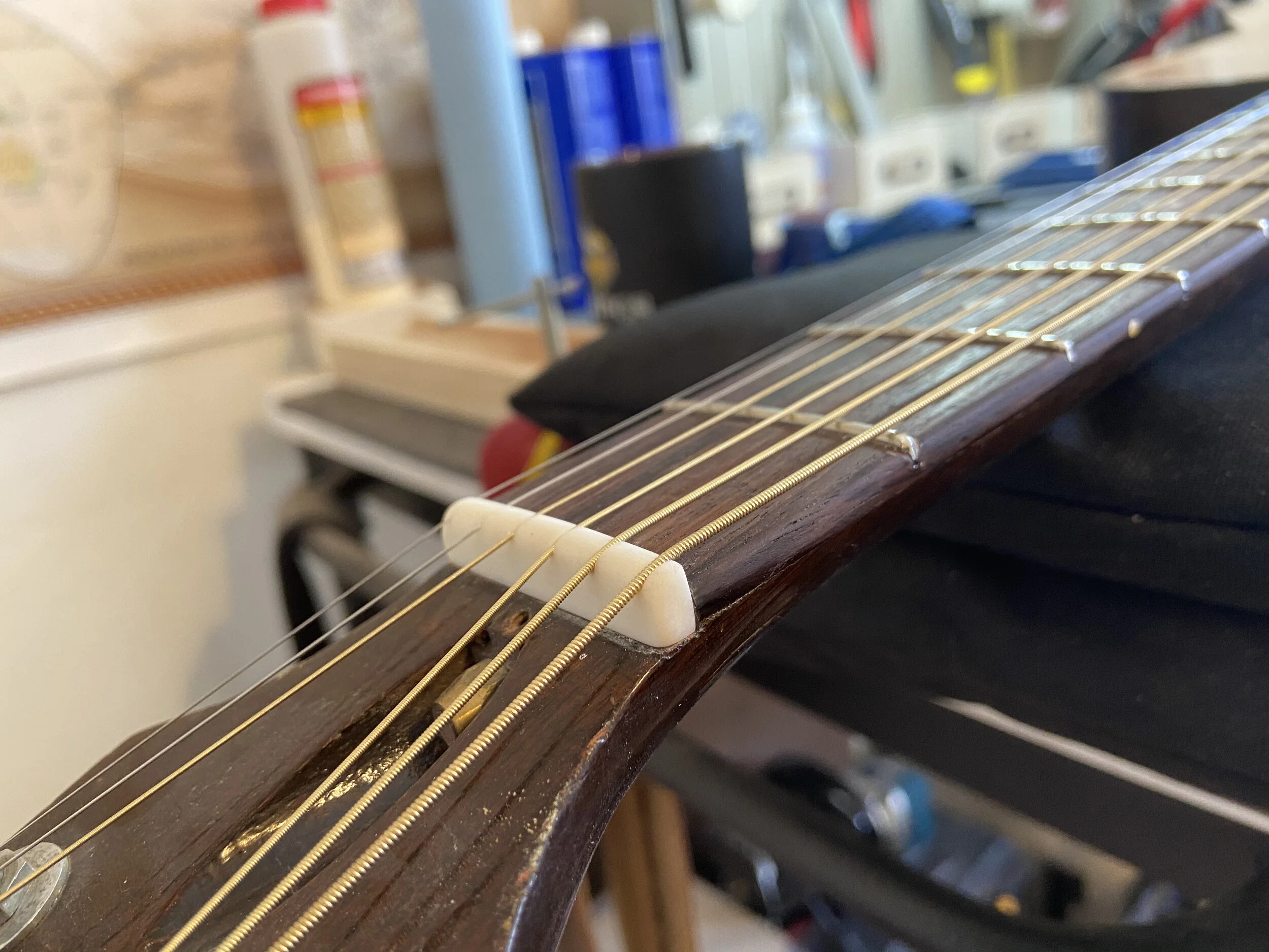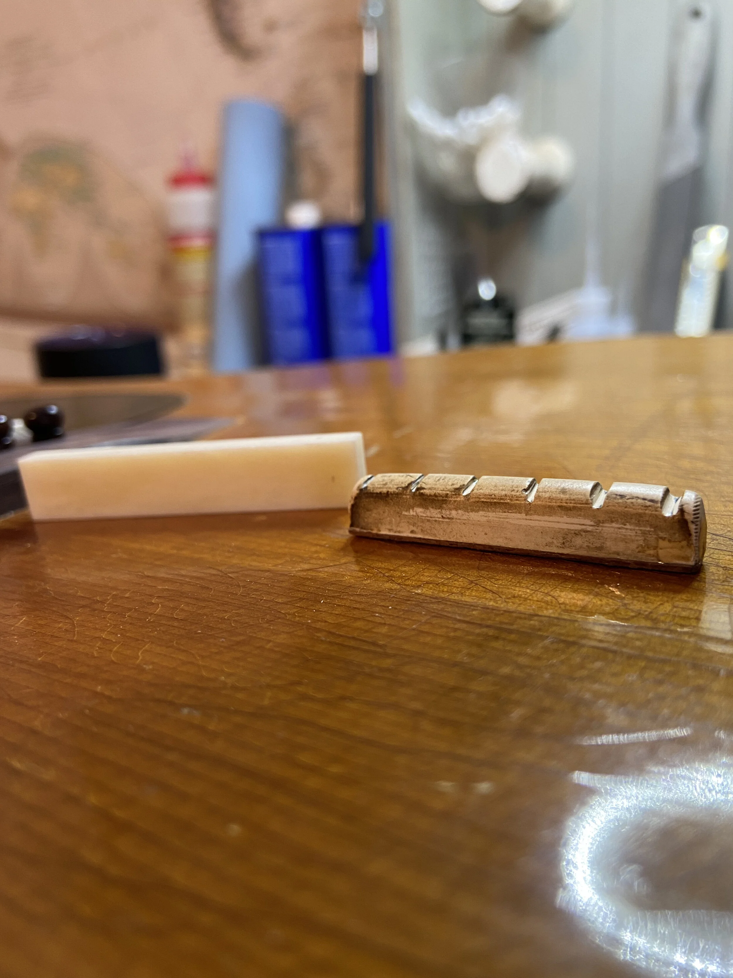 I really wanted to keep the original nut because it's cool and worn, but it's plastic. So a new nut it is.