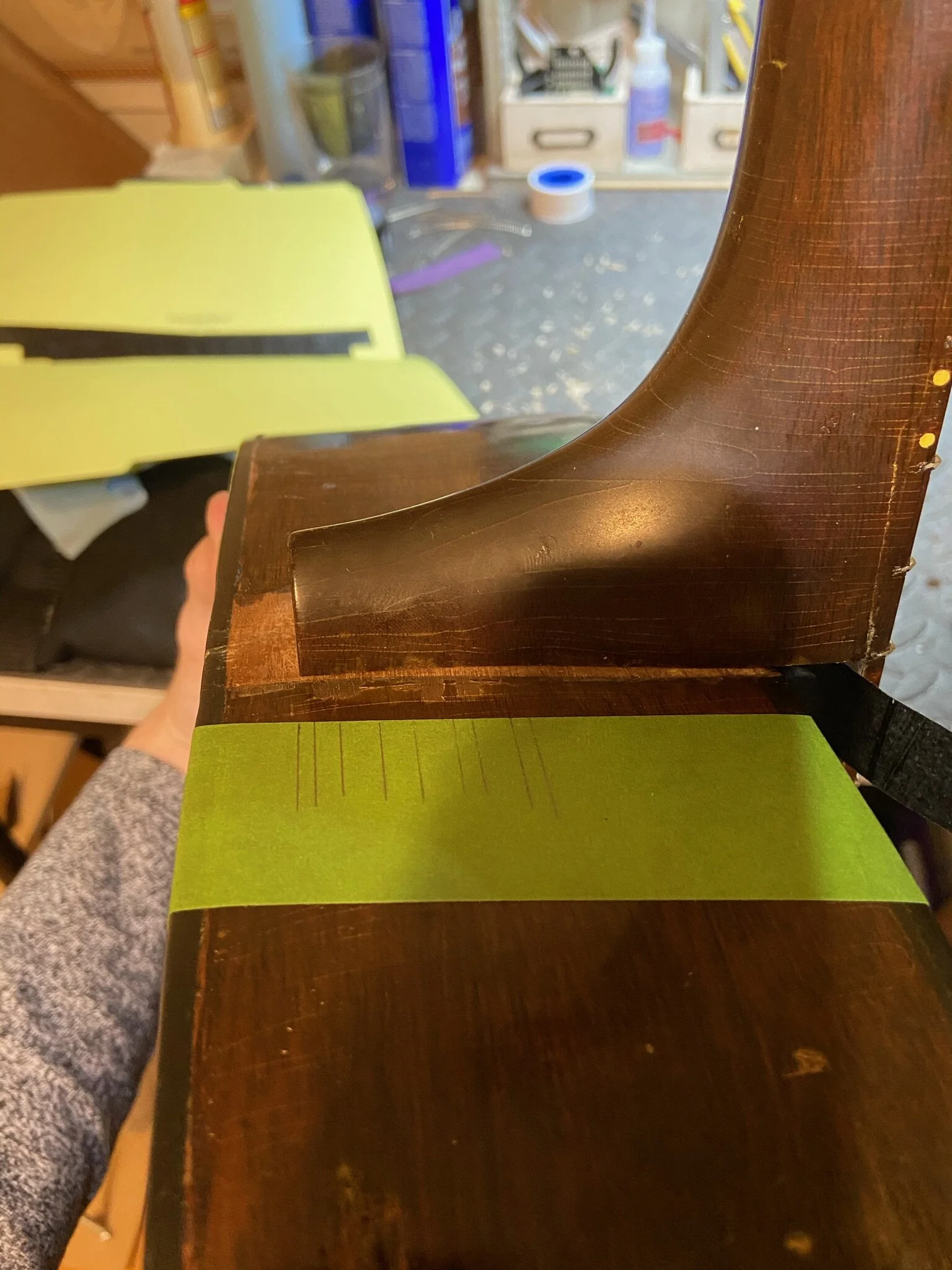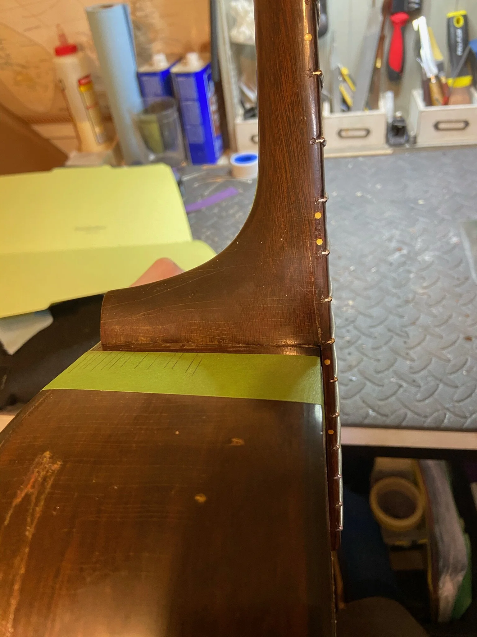 Starting the neck reset. The goal is for a straightedge to lay flat across the frets and land right on top of the piece of wood. For that to happen, I'll need to remove material at the heel to change the angle of the neck.