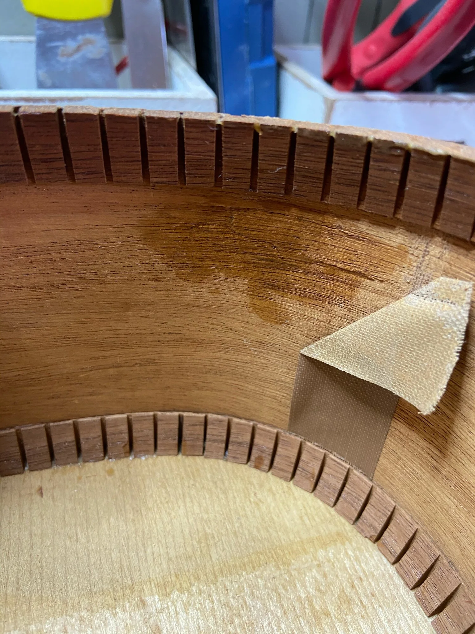 Ready to radius the sides to match the radius of the back. By using a radius dish covered in sandpaper, I'm able to rotate the dish on top of the sides, which slowly conforms them to the radius and removes all the chalk.