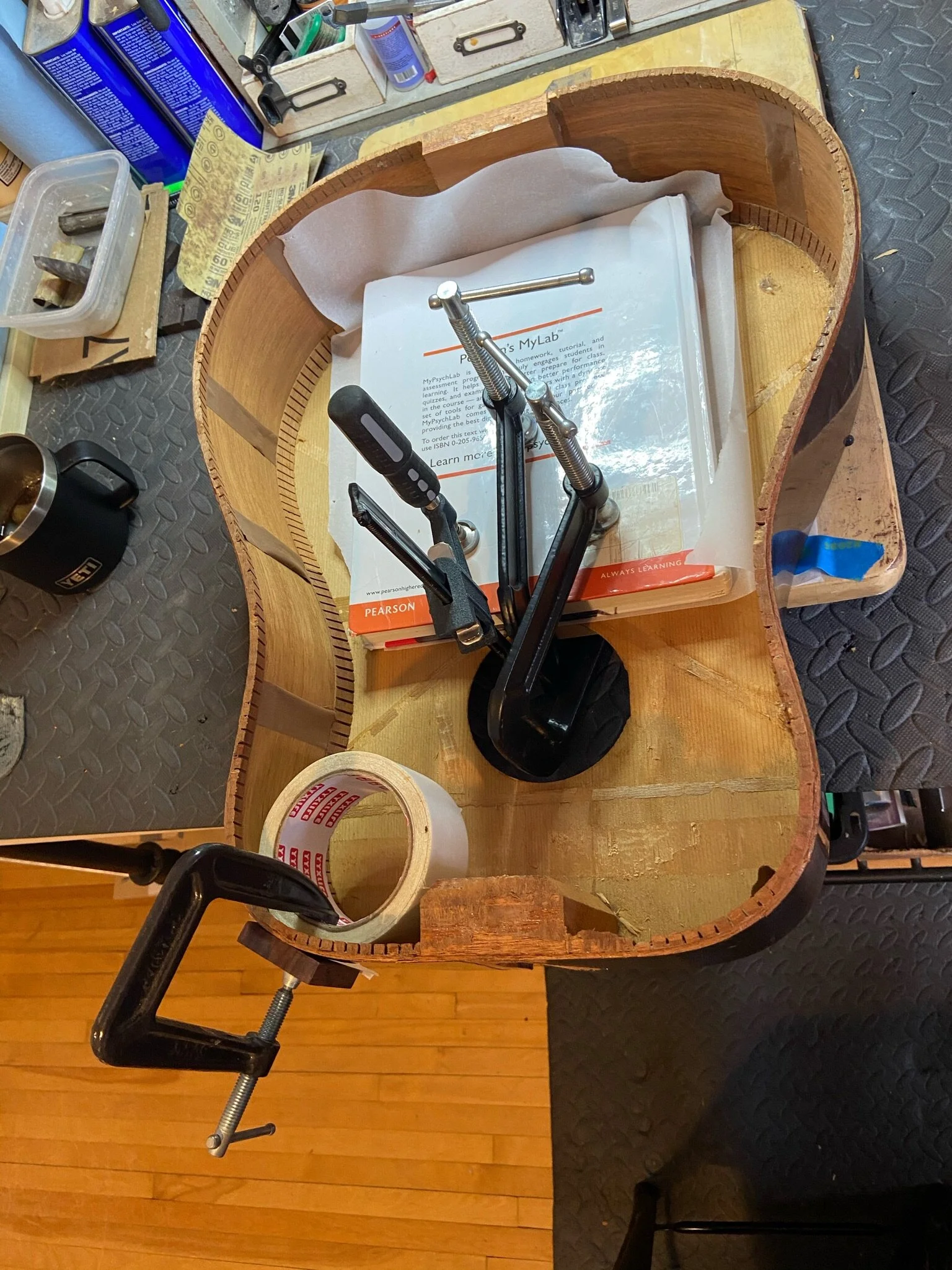 Gluing up the neck and fingerboard extension. The end is in sight!
