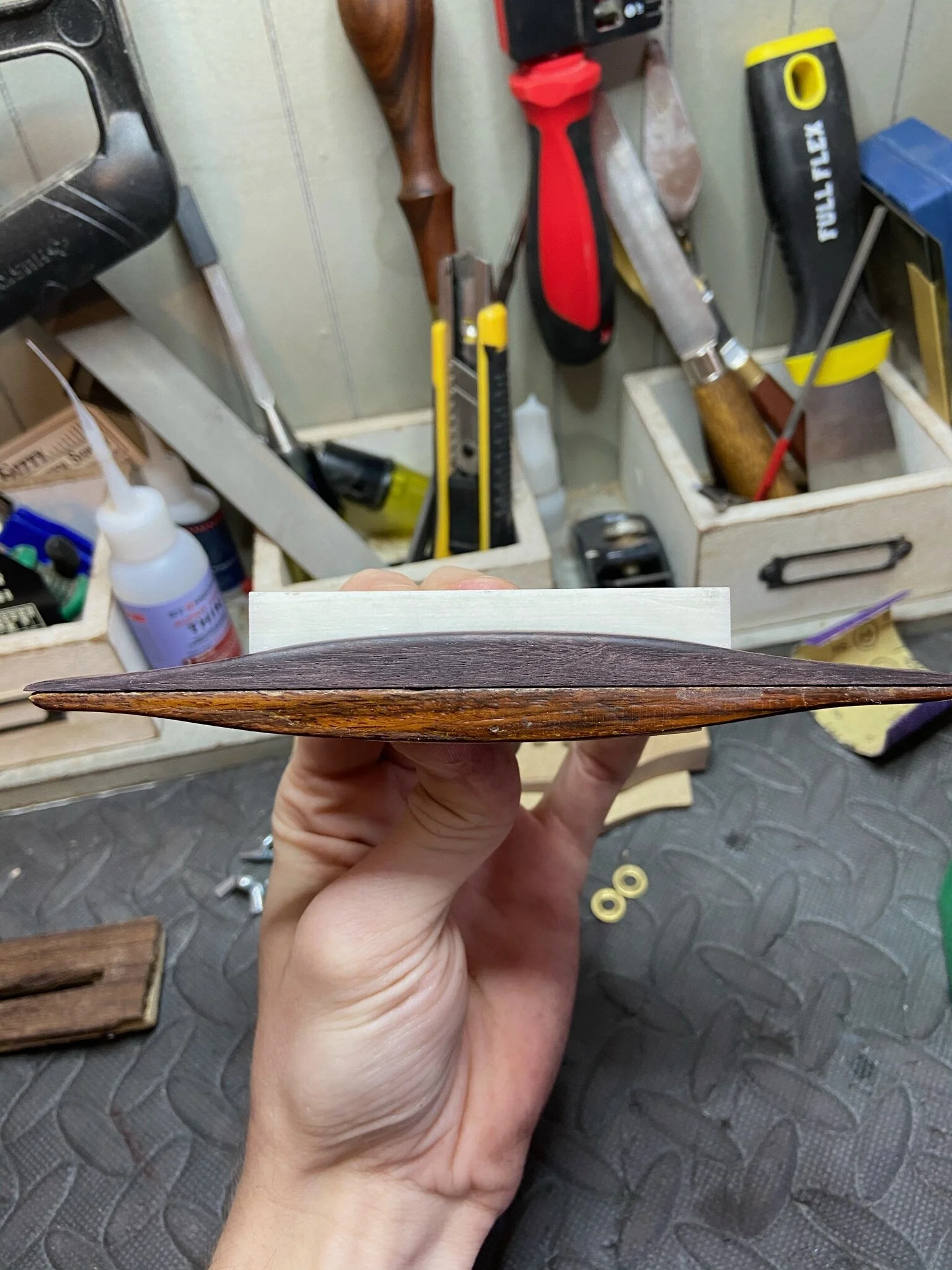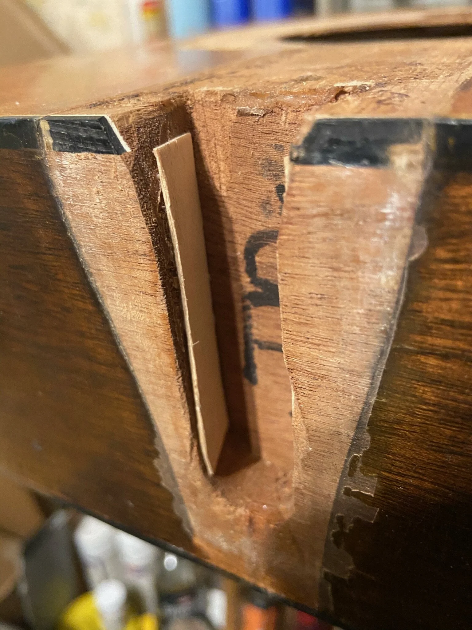 Another shot of the glued-closed side gouge. That was essentially a jagged hole before. Thankfully all wood was still attached, so I didn't need to graft in another piece of Mahogany.